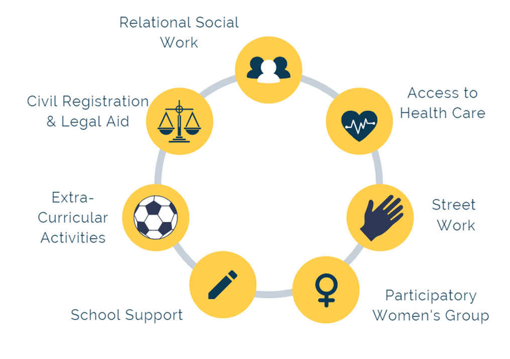 During street work our social workers simply walk the set locations and build informal relationships with community members, store owners, and the many children who play, work, and inhabit the street. Children who are identified at-risk of meeting or do meet our entry points are signalled to the social work team and processed through our referral system.